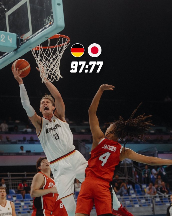 JRS低调看直播讯 7月27日讯 奥运男篮小组赛B组,德国对阵日本。开场后施罗德和泰斯两人联手带领德国建立领先,日本则连续命中三分将比分咬住。第二节德国有内有外一度建立起16分优势,河村勇辉和八村塁又帮助日本稳住阵脚将分差拉回个位数。易边再战,德国多点开花再次打出攻势将分差拉开,第四节日本也无力缩小分差,最终德国97-77轻松击败日本取得开门红。