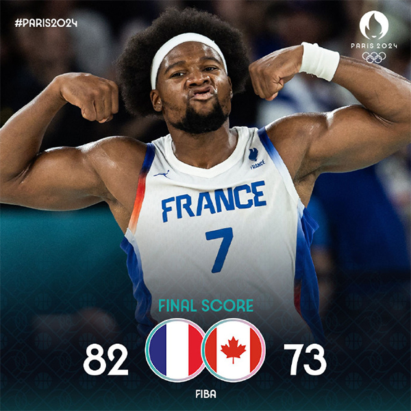JRS低调看直播讯 8月7日讯 奥运男篮1/4决赛,法国对阵加拿大,本场比赛法国主动变阵将戈贝尔和富尼耶撤下主力。开场后法国状态不错,尤其是提上首发的科尔迪尼耶首节独得10分,反观加拿大先发手感低迷打了8分钟只得5分。第二节加拿大状态稍有回暖,法国坚决进攻内线制造杀伤,亚历山大手感回暖连连砍分一度帮助加拿大将分差追到个位数,但法国依靠亚布塞莱和莱索尔坚决冲击内线又将比分拉开。下半场回来亚历山大状态依旧火热,他再次帮助加拿大追到只差8分,法国依靠积极的拼抢稳住阵脚,末节两队亚历山大和巴雷特两人联手多次发起反扑,关键时刻富尼耶连续砍分并且命中一记超远三分帮助法国始终保持优势,加拿大无力回天,最终法国82-73击败加拿大晋级四强。