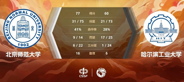 JRS低调看直播讯3月12日 CUBAL东北赛区小组赛,北京师范大学对阵哈尔滨工业大学。首场小组赛,两队皆获胜。比赛开始,吴士广篮下先拿2分为北京师大开局,哈工大开局很是慢热被北京师大打出9-0开局。打了3分钟杨淳君终于为哈工大开局,周鑫也连续得分,但吴士广补篮回应,肖洋三分开和后北京师大领先到双位数。周鑫三分再止血,吴士广继续二次进攻打成,首节北京师大26-12领先哈工大。次节上来,哈工大进攻端还是不在状态,北京师大顺势扩大领先。辛泽林造杀伤终于打破僵局,但两队进攻端命中率都不高,场上频频打铁。随后高梓淇接连三分命中帮助北京师大稳住领先优势,杨淳君连续前场篮板终于打成二次进攻拿到运动战进球得分,半场北京师大43-26继续领先哈工大。易边再战,双方连续几回合尝试三分但都没有命中,打了3分多钟各自仅得2分。杨淳君冲击造杀伤、强打2+1带队追分,北京师大及时调整,邵振恒站出来连续抢到前场篮板,里突外投三分也开和砍下7分强势回应。哈工大还是依靠拼抢前场篮板获得进攻机会,连续罚球追分,但三节北京师大57-46还领先哈工大11分。末节决战,双方上来又是连续打铁,邵振恒连攻加传帮助北京师大牢牢掌握住十几分领先。江龙接连打成二次进攻止血,但肖洋三分被犯规后三罚全中再回应,随后肖洋里突外投再连得6分杀死比赛,最终北京师大77-60战胜哈工大。