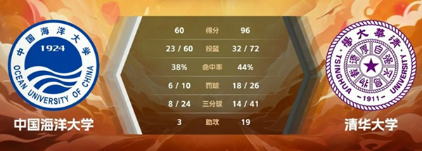 JRS低调看直播3月15日讯 CUBAL一级联赛东北赛区,中国海洋大学今日对阵清华大学,双方目前都是三胜零负未尝败绩。比赛上来,两队进入状态都较慢,直到一分多钟任霄鹏才利用罚球打破僵局,而清华大学这边在两分半之后才拿到首分,双方短暂拉锯后清华大学突然发力,他们一波16-0的小高潮将分差拉开到两位数,首节结束,清华大学28-17领先中国海大。次节回来,中国海大在前两分钟的时间里没有得分,清华大学连拿五分继续扩大着自己的领先优势,中国海大此后虽有反扑势头,但却迎来了清华大学更加凶猛的进攻高潮,半场战罢,清华大学51-33领先中国海大。易边再战,双方的进攻表现都出现下滑,尤其是中国海大72这边,他们单节只拿到了7分,而清华大学这边还是突破了20分,单节净胜14分后分差已经突破了三十分,三节结束,清华大学72-40领先中国海大。末节比赛,双方都打得相对放松,很多球员也都获得了上场的机会,不过中国海大依旧没有获得任何迫近比分的机会,分差已经达到了四十分以上,最终清华大学96-60大胜中国海大。