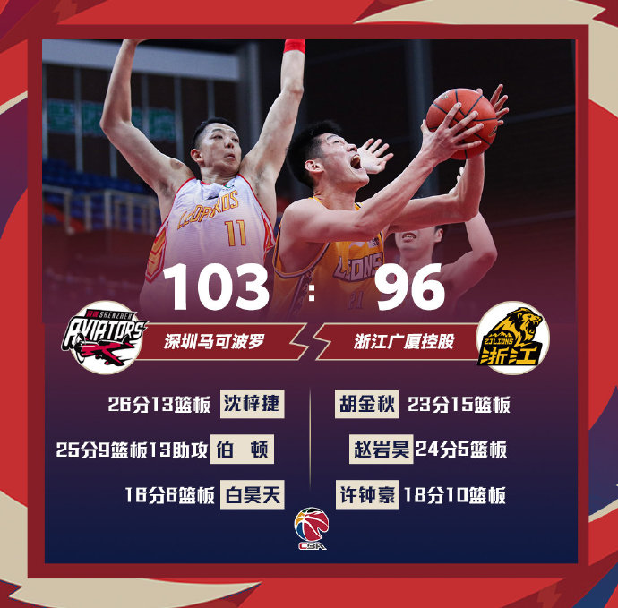 深圳(27-22):沈梓捷26分13篮板4助攻1断1帽,肯尼-伯顿25分9篮板13助攻,卢艺文12分1篮板1助攻,白昊天16分6篮板3助攻,杨林祎11分2篮板3助攻,于梁2分1篮板