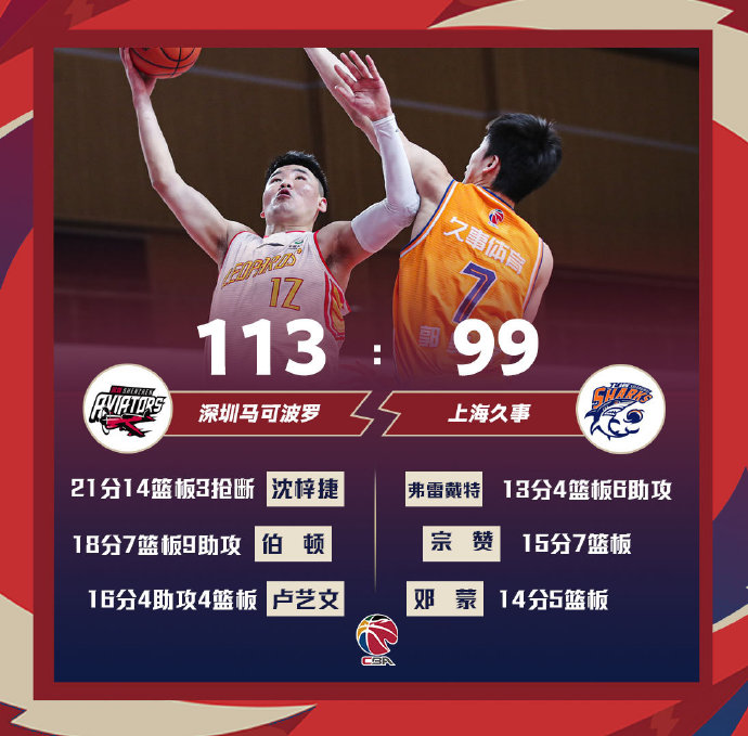 JRS低调看直播4月5日讯 今日CBA常规赛,深圳迎战上海。深圳排名积分榜第8,上海最近遭遇两连败,22胜27负排名积分榜第13。比赛开始,上海首先发力取得6分领先,随后于梁里突外投连续拿分替深圳缩小分差,首节结束时,上海23-22仅领先深圳1分。次节上来,双方比分依旧胶着,上海抓住深圳失误一度领先5分,深圳快速调整后始终紧咬比分不放。易边再战,卢艺文外线爆发连中3记三分,上海进攻效率降低,深圳不断扩大领先优势,三节结束,深圳84-74领先上海10分。末节上来,上海打出一波8-3将分差缩小至只剩5分,但之后深圳里突外投接连得手,一度将分差扩大至16分,比赛随即失去悬念。最终,深圳113-99战胜上海。