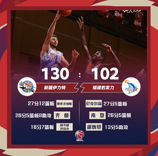 新疆:齐麟26分5板8助4断、莫泰尤纳斯27分12板3助、于德豪11分9助、曾令旭12分11助、唐才育13分、阿不都沙拉木16分7板、热甫卡提江8分8板