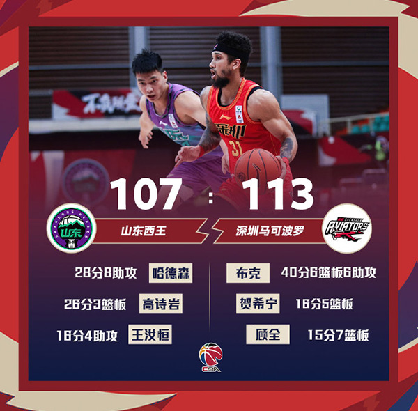 JRS低调看直播1月17日讯 CBA常规赛第31轮迎来最后较量,上轮力克青岛的山东迎战两连败的深圳,首节一上来深圳外线率先开张,单节命中5记三分的他们,首节结束时已经取得10分领先,次节回来后山东进攻手感回暖,两队外线火热对飚,半场战罢,深圳继续领先11分。易边再战后山东轰出17-5攻击波反超比分,末段深圳回敬一波13-1小高潮,三节结束后深圳依然领先11分,末节决战,高诗岩联手哈德森不断追分,关键时刻布克和贺希宁先后取分,最终深圳113-107力克山东。