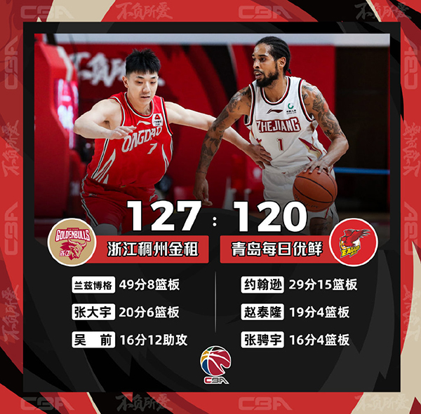 JRS低调看直播12月29日讯 浙江与青岛展开常规赛较量,上半场浙江外援兰兹博格手感火热,他里突外投频频得手,个人独砍29分,率领浙江一路保持着领先。青岛主帅吴庆龙在第二节对判罚不满连续吃到技术犯规,被直接驱逐离场。半场战罢,浙江以58-50领先。易边再战,青岛找到手感,赵泰隆和赵大鹏连中三分,达卡里-约翰逊在篮下连续砍分,里外开花的青岛追近比分。不过,吴前和兰兹博格在末节及时站出来轮番得分,率领浙江重新扩大领先。最终,浙江以127-120击败青岛,取得2连胜,青岛则吞下2连败。