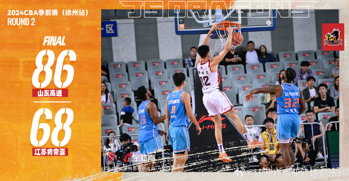 JRS低调看直播 9月21日讯 CBA季前赛江苏徐州赛区,江苏对阵山东,首场季前赛两队皆吃到败仗。比赛开始,全华班的江苏进攻端很困难,于德豪带领山东连续打成反击打出21-5梦幻开局,随后江苏接连罚球追分,但谢智杰有攻有传稳住13分领先,次节双方命中率都有下降,山东队双外援还与江苏球员发生冲突,双方连续走上罚球线,但山东还是保持住13分领先。下半场,山东上来一波11-2直接拉开20分以上领先,随后双方围绕着20分左右分差展开拉锯战,末节山东连续失误,江苏一波10-4小高潮追近比分,但山东依靠许梦君三分回应稳住优势,最终山东86-68轻取江苏。