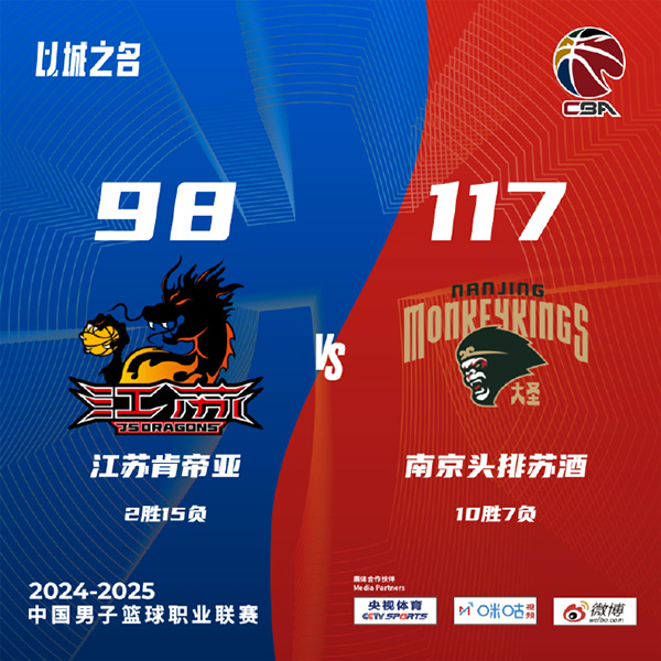 JRS低调看直播讯2024年12月14日讯 CBA常规赛,江苏和同曦迎来德比。江苏目前2胜14负,同曦9胜7负。一开场,双方势均力敌,比分始终紧咬,江苏不断冲击内线频频得手,同曦内外开花迅速回应,次节同曦占得先机,此后却突然哑火,江苏轰出17-0强势反超,郭昊文高效发挥带队追赶,半场战罢双方战成60平。下半场,郭昊文延续火力,得分助攻一肩挑带队将分差拉开到两位数,末节林葳连中三分将分差拉开到20分,江苏大势已去无力回天。最终,同曦117-98击败江苏,赢下德比。