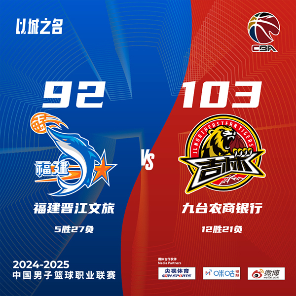 JRS低调看直播讯 北京时间1月20日讯 CBA常规赛继续进行,福建主场迎战吉林,吉林近期遭遇连败,目前11胜21负暂列联赛第15位,福建上场不敌广东,5胜26负联赛垫底。此役一上来双方便陷入缠斗,约瑟夫-杨和邹阳联手取分,琼斯盘活全队强势回应,两队你来我往比分紧咬,首节结束时福建领先2分,次节回来,双方继续鏖战,路易斯-金突然发力单节贡献12分,琼斯和基兹林克接连回应,半场战罢,福建依然领先2分。短暂休整后福建一波8-0一度拉开比分,吉林及时回暖连中三分,三节结束后吉林反超1分,末节决战,福建进攻滞涩,琼斯予取予求率队奠定胜势,福建追分无望,最终吉林103-92力克对手。
