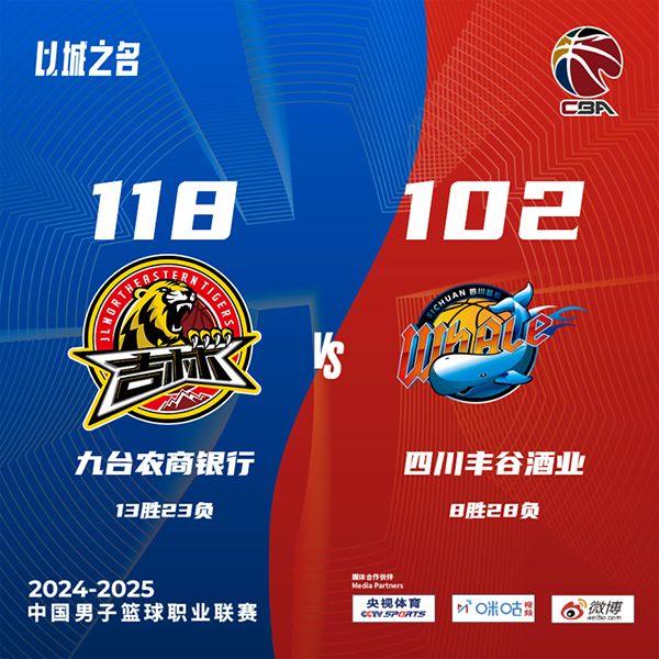 JRS低调看直播讯北京时间3月5日讯 CBA常规赛战火重燃,吉林坐镇主场迎战四川,四川目前8胜27负排在联赛第17位,吉林12胜23负位列第14。此役一上来双方早早进入状态陷入僵持,琼斯连续取分对飚萨姆纳,首节结束时吉林领先2分,次节回来,双方延续火力拉开对攻,萨姆纳联手亨特不断打进,但基兹林克单节狂揽20分强势回应,半场战罢,吉林确立10分优势。短暂休整后王薪凯连中三分掀起反扑号角,四川多点开花蚕食分差,三节结束后吉林仅领先1分,末节决战,四川进攻彻底断电,吉林延续火力终结悬念,最终吉林118-102击败四川送对手7连败。