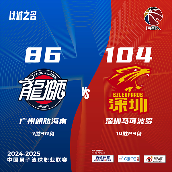 JRS低调看直播讯北京时间3月8日中国男子篮球职业联赛 常规赛,广州朗肽海本对阵深圳马可波罗。半场广州42-55深圳,最终广州86-104深圳。广州朗肽海本张兴亮16分4板3助,袁照耀12分5板1助;深圳马可波罗马凯尔-约翰逊24分4板9助,贺希宁23分4助。
