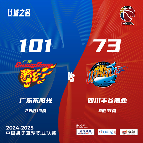 JRS低调看直播讯北京时间3月12日讯 CBA常规赛继续进行,广东主场迎战四川,广东上场大胜新疆,目前25胜13负位列联赛第6,四川苦吞9连败,8胜30负排在联赛第17位。此役一上来广东状态慢热单节仅得到16分,四川外援马里奇连投带罚接连取分,率队打出16-4梦幻开局,首节结束时四川领先9分,次节回来,广东找到进攻感觉,伯克连中三分率队回敬15-4攻击波一举反超,半场战罢,广东反超确立9分优势。易边再战后四川仅靠马里奇苦苦支撑,广东内外开花扩大优势,三节结束后广东已经领先28分,末节上来,四川进攻乏力追分无望,比赛提前失去悬念,两队陆续换上替补,最终广东101-73大胜送四川10连败。