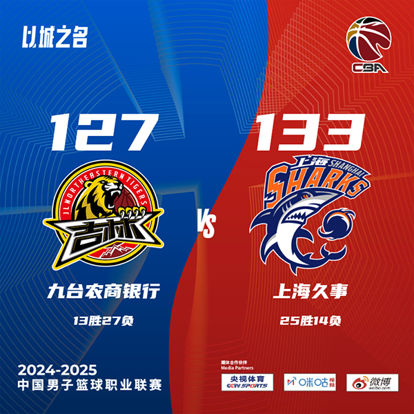 JRS低调看直播讯 北京时间3月14日中国男子篮球职业联赛 常规赛,九台农商银行对阵上海久事。半场吉林75-80上海,最终吉林127-133上海。九台农商银行多米尼克-琼斯30分12板14助,托马斯-基兹林克27分2板5助;上海久事洛夫顿29分13板13助,李添荣28分3板3助。