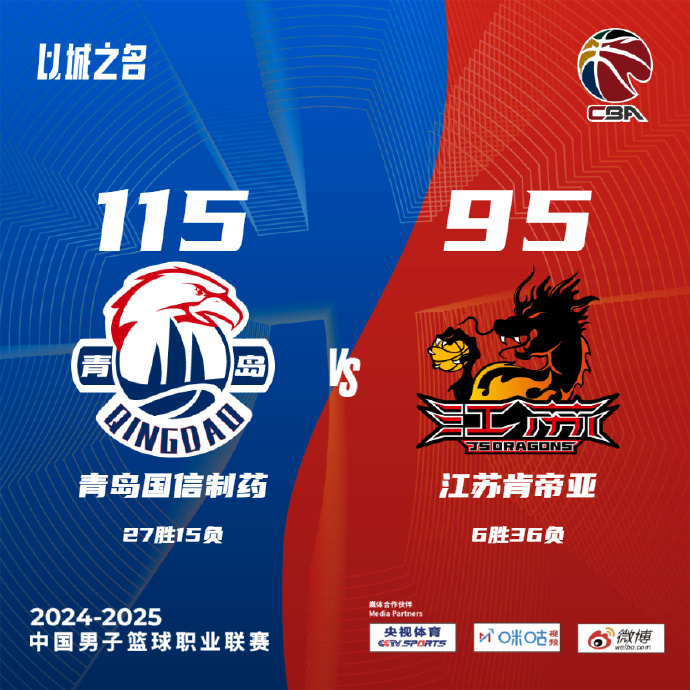 JRS低调看直播3月19日讯 CBA常规赛,青岛主场迎战江苏。青岛26胜15负排在联赛第9,江苏6胜35负联赛垫底。一开场,江苏打出8-3的开局,青岛轮番冲击篮筐频频得手迅速扳平比分,此后双方陷入缠斗,青岛持续发力打出10-0的攻击波确立两位数优势,江苏不断杀入内线拿分努力追赶,半场战罢青岛63-54领先江苏。下半场,青岛攻防两端压制对手,一举将分差拉开到20分以上,末节青岛稳扎稳打将优势保持到最后,最终,青岛115-95大胜江苏,送给对手8连败。
