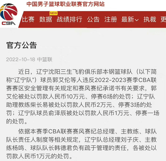 在第一阶段期间,郭艾伦被CBA联盟重罚,原因是没有经过同意的情况下外出,离开赛区禁赛6场还被罚款10万,第一阶段直接报销。除了郭艾伦之外,辽篮的助教柴长易罚款2万元和停赛3场、球员俞泽辰罚款1万元和停赛1场,总经理刘子庆、主帅杨鸣、队长韩德君各罚款1万元。辽篮、杨鸣和郭艾伦也进行道歉,郭艾伦的缺席对于辽篮的影响很大,辽篮也没有人入选到最新一期的国家队集训名单张。