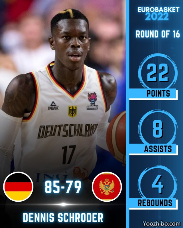 德国:施罗德22分4篮板8助攻1抢断5失误、小瓦格纳14分5篮板1盖帽、毛多-罗14分4篮板3助攻、泰斯9分4篮板1助攻1盖帽;