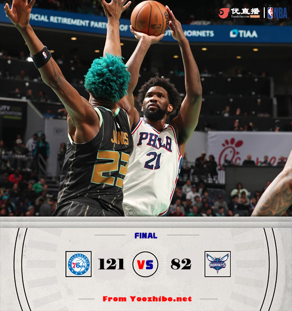 JRS低调看直播3月18日讯 NBA常规赛,黄蜂今日迎战76人,前者三连败后排在东部倒数第二位,后者则是三连胜暂列东部第三位,此役马丁和马克-威廉姆斯缺战。比赛上来,两队就陷入到拉锯战,场上比分交替领先,次节前半段黄蜂依旧能够与对手保持胶着,但之后76人突然发力占据场上主动,分差也是逐渐拉开到了两位数,半场结束时黄蜂落后12分;下半场回来黄蜂直接断电,前四分钟时间里一分未得,76人趁势一波11-0的小高潮将分差扩大到二十分以上,末节上来76人再轰13-0后分差突破了三十分,比赛彻底失去悬念,最终76人大胜黄蜂迎来四连胜。