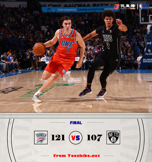JRS低调看直播3月15日讯 NBA常规赛继续进行,雷霆主场迎战篮网,两队此前均取得两连胜,雷霆33胜35负排名西部第十一,篮网则是39胜29负位列东部第五。比赛开局,雷霆率先发力,打出一波7-0的小高潮,但随后进攻端断电,篮网则找到进攻状态,反超并建立两位数的领先优势。次节两队交替取分,分差在十分上下浮动,半场结束篮网62-52领先。易边再战,场上形势风云突变,雷霆外线连续投中,篮网则运动战连连失准,雷霆单节打出38-20,逐渐反超并领先到8分进入第四节。末节上来,雷霆稳扎稳打维持差距,篮网没能再追上比分,最终雷霆121-107逆转战胜篮网,取得三连胜。