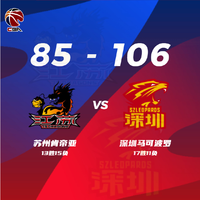 JRS低调看直播1月19日讯 CBA常规赛第二阶段江苏对阵深圳,江苏目前排在联赛第十三,最近球队状态低迷遭遇4连败,深圳则排在联赛第八,上场比赛他们不敌广州,沈梓捷继续因为肩伤缺阵。开场后江苏首先在外围发炮,开场不久赵率舟和马建豪就命中五记三分,深圳则是内外开花打得更为合理,孙浩钦和贺希宁轮番拿分,首节深圳取得5分优势。第二节回来布莱克尼开启得分模式连连砍分,但深圳得分点更多,顾全和萨林杰帮助深圳守住领先优势,上半场深圳51-45领先。下半场回来江苏依旧主要靠双外援拿分,深圳这边则是萨林杰和顾全一内一外打得风生水起,他们帮助深圳将分差拉大到两位数,江苏也开始失误增多,分差一度被拉大到20分。此后深圳牢牢占据场上的主动,顾全也持续火热手感,双方的分差继续被拉大,比赛彻底失去悬念,最终深圳106-85轻松拿下胜利送给江苏5连败。