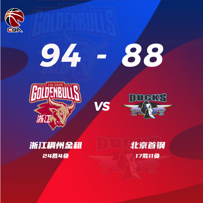 JRS低调看直播1月18日讯 CBA常规赛第二阶段进入尾声,浙江对阵北京,浙江目前23胜4负高居积分榜榜首,而北京最近状态不佳,3连败后17胜10负排在第6位。上半场双方命中率并不是很高,浙江队吴前手感不佳,但好在其余队友能给予进攻端的帮助,而北京队更是不在状态,首节只拿到16分,次节依靠约翰逊的强打北京一度反超比分,但浙江迅速调整,多点开花都能得分还是稳住领先。下半场,双方进攻端终于有起色,方硕、曾凡博联手翟晓川砍下18分帮助北京直接追平比分,随后双方命中率又有回落,但是展开胶着拉锯战,浙江通过外线三分重新反超并拉开比分,吴前连续失误又给北京机会,好在摩西-赖特关键抛投打进后又快下暴扣锁定胜局,最终浙江94-88力克北京,拿到3连胜的同时送对手4连败。