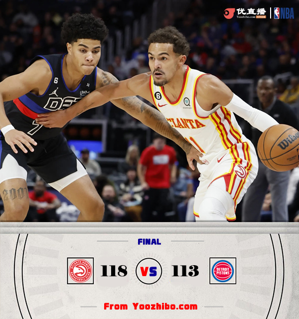 JRS低调看直播讯10月27日讯 NBA常规赛老鹰对阵活塞,老鹰上场比赛不敌黄蜂遭遇赛季首败,活塞则是最近遭遇3连败。上半场老鹰靠着亨特和特雷-杨两人的发挥取得领先,康宁汉姆状态不错联手博格达诺维奇努力追分,第二节老鹰手感有所下降,活塞在康宁汉姆的带领下迫近比分,上半场老鹰只领先1分。下半场回来活塞一度完成反超,但老鹰及时调整在特雷-杨的带领下夺回领先,最终老鹰118-113力克活塞。