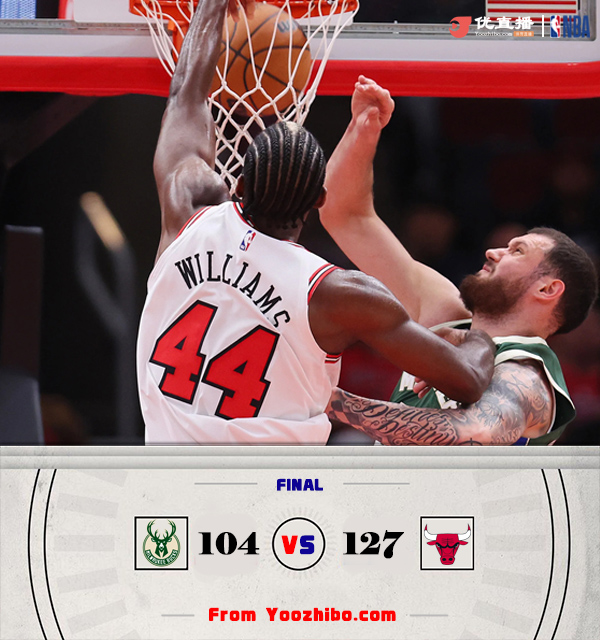 JRS低调看直播10月12日讯 NBA季前赛,公牛对阵雄鹿。公牛这边武切维奇率领轮换阵容,雄鹿则是尽遣替补。一开场,前半段雄鹿稍稍占优,公牛一波14-3领先7分结束首节。次节上来,双方大打对攻,分差始终紧咬,半场战罢公牛61-59领先2分。易边再战,公牛持续发力取得两位数领先,雄鹿努力追赶,三节打完公牛89-79领先10分。第四节,公牛牢牢占据主动将分差拉开到20分以上,雄鹿无力回天。最终,公牛127-104大胜雄鹿。