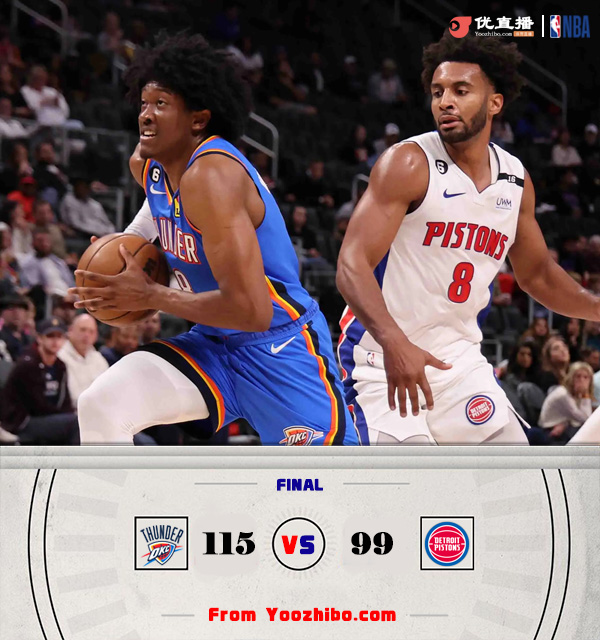 JRS低调看直播 10月12日讯 NBA季前赛今日继续,活塞迎战雷霆。两队新赛季都将继续以锻炼新人为主。一开场,雷霆连中三分,活塞内外开花给出回应。巴格利伤退,活塞三分4连击领先4分结束首节。次节上来,双方依旧打得难解难分,比分交替领先,双方互送进攻高潮,活塞半场结束时57-54领先3分。易边再战,雷霆连续打出进攻高潮取得两位数优势,活塞顽强追赶,三节打完雷霆反超8分。第四节,雷霆持续发力将分差拉开到20分,活塞大势已去无力回天。最终,雷霆115-99击败活塞,取得胜利。