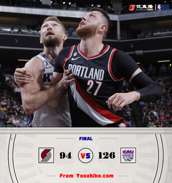 JRS低调看直播10月10日讯 NBA季前赛继续进行,开拓者客场挑战国王,比赛开始后两队早早进入状态,福克斯外线对飚西蒙斯,中段开拓者进攻断电,许尔特连中三分率队打出12-2攻击波,末段开拓者进攻再次停滞,萨博尼斯予取予求率队再次打出9-0小高潮,首节结束后国王确立12分优势,次节回来,开拓者找回进攻状态,两队你来我往火热对攻,努尔基奇联手西蒙斯不断追分,但国王多点开花总能及时回应,半场战罢,国王已经领先17分。易边再战后国王延续进攻火力,莱尔斯和蒙克轮番冲击,国王再度打出13-3攻击波,三节结束后国王将分差扩大到21分,末节上来,两队接连换上替补阵容,比赛提前失去悬念,最终国王126-94大胜开拓者。