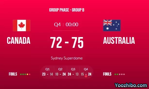 末节,澳大利亚凭借顽强的拼劲,两队多次打平。阿米西尔两罚全中,塔尔波特上篮得分,惠特科姆三分帮助澳大利亚70-65领先。加拿大女篮两罚全中,惠特科姆两罚中一。内线塔尔波特反篮拿下关键的两分,加拿大犯规送对手两罚全中,澳大利亚75-69领先加拿大女篮6分,对加拿大女篮来说时间不多了,只剩19.3秒。阿乔恩瓦三分打进,最终澳大利亚75-72险胜加拿大女篮。