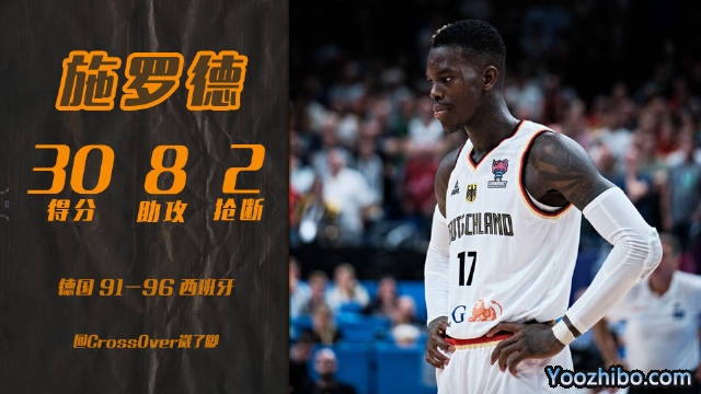 单节比分:24-27、27-19、20-19、20-31(西班牙男篮在后)。 德国:施罗德30分8助攻2抢断,小瓦格纳15分3篮板3助攻,奥布斯特15分5篮板,泰斯10分3篮板,蒂曼6分2篮板3助攻3抢断,罗9分2助攻。