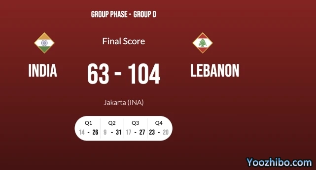 JRS低调看直播讯:北京时间7月17日讯 男篮亚洲杯小组赛继续进行,印度男篮对阵黎巴嫩男篮,最终,印度队63-104、41分惨败给了黎巴嫩队,第二节单节印度队更是9-31,又是一场惨案,印度队遭遇了3连败,这三场合计输了136分。