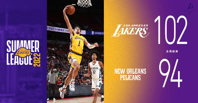 JRS低调看直播讯7月16日讯 NBA拉斯维加斯夏季联赛继续进行,湖人对阵鹈鹕,湖人新秀中看点有两位名宿之子,小皮蓬和小奥尼尔,还有35号秀克里斯蒂;而鹈鹕8号秀丹尼尔斯还没有亮相。湖人上来先打出不错开局,但鹈鹕也能凭借中投手感咬住比分,佩蒂接连扔进三分连砍8分帮助鹈鹕取得领先,次节鹈鹕进攻端显得无章可言,而湖人外线则是火力全开,以斯维德为首的射手群接连下起三分雨,湖人也连续打出小高潮反超了8分。第三节,斯维德继续保持上半场的火热手感里突外投帮助湖人将分差拉开至双位数,鹈鹕多次缩小分差,湖人依靠外线三分总能回应,末节湖人换上替补练兵,但外线手感能保持住,分差保持在10分左右,最终湖人力克鹈鹕。