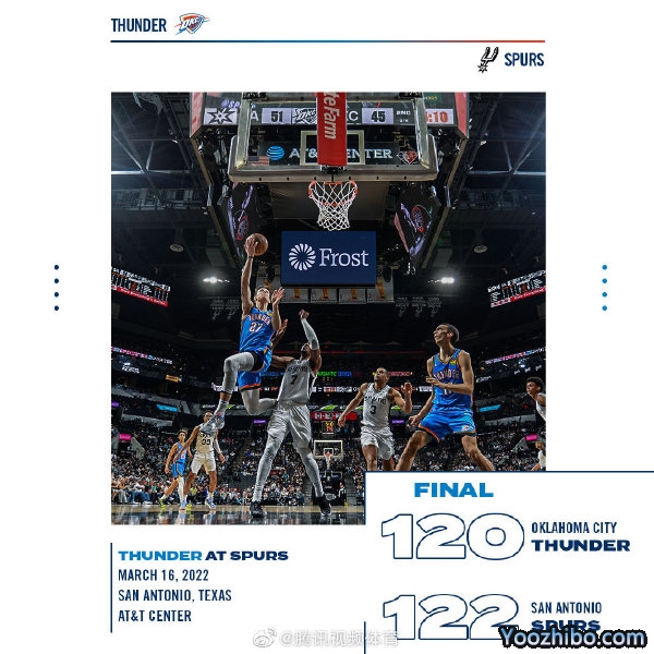 JRS低调看直播3月17日讯 NBA常规赛,马刺主场迎战雷霆。在波波维奇登顶教练胜场数第一后球队又遭遇了2连败,剩下的目标只有锻炼新人。雷霆已然遭遇6连败,亚历山大多次成为空砍群群主。一开场,马刺率先发力迅速取得两位数领先,雷霆多点开花顽强追赶,马刺领先8分结束首节。次节比赛,雷霆大举反击将比分扳平,马刺连中三分夺回优势,半场战罢马刺68-56领先12分。易边再战,雷霆打出8-0的攻势缩小分差,马刺连中三分扩大优势,贝兹利和亚历山大合力贡献16分顽强咬住,三节打完马刺领先7分。第四节,雷霆一波11-0将比分反超。马刺回敬9-3的小高潮重夺领先,关键时刻波库干扰凯尔登的扣篮并连得5分带队反超,沃克三分命中,亚历山大错失反绝杀三分,马刺惊险过关。