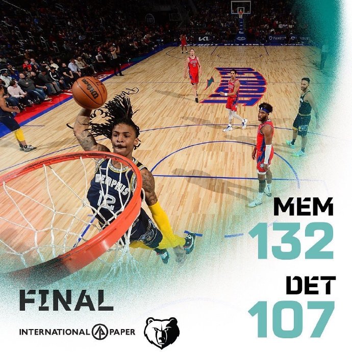 JRS低调看直播2月11日讯 NBA常规赛灰熊对阵活塞,灰熊近来状态不错取得3连胜,活塞5连败后继续东部垫底。开场后灰熊早早打出攻势取得领先,首节活塞进攻表现一般防守也比较差劲,灰熊单节便取得22分领先。第二节活塞不断冲击内线掀起反扑,不过灰熊外线手感稳定多次射中三分,上半场灰熊65-50领先。下半场回来两边大打对攻战,格兰特和迪亚洛两人轮番砍分,但灰熊在莫兰特带领下也是打得风生水起,第三节两队打成平手,最后一节灰熊仍旧占据场上主动,一直保持20分左右的优势,活塞无力缩小分差,最终灰熊132-107轻取活塞迎来4连胜。