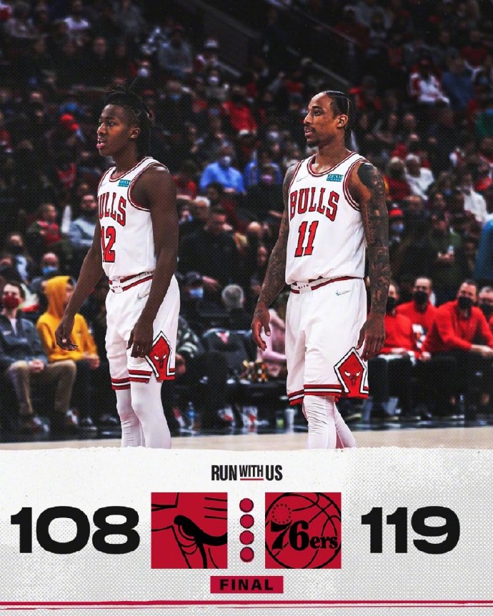 JRS低调看直播2月7日讯 NBA常规赛继续进行,公牛主场迎战76人,公牛目前33胜19负高居东部榜首的位置,而76人虽然恩比德力挽狂澜,但由于伤病等因素,暂时31胜21负排在东部第5位,本场拉文继续伤缺。开局双方上来就展开对攻战,恩比德和德罗赞分别撑起各自球队的进攻,后半节76人抓住公牛的得分荒通过外线连续发炮建立起领先,次节76人继续保持住优势,恩比德内线无人可挡一度帮助76人将优势拉开至15分,但德罗赞继续保持自己不错的手感帮助公牛回应小高潮止血,76人依然保持9分领先。第三节76人找到外线手感,在恩比德带领下重新将分差拉开至双位数,公牛进攻端只能靠德罗赞个人能力勉强咬住8分分差,末节76人先打出9-0小高潮拉开比分,但武切维奇站出来帮助公牛迅速回应13-0续命,恩比德上来后又连续强打内线重新稳住两球以上领先,德罗赞独木难支,最终76人力克公牛,止住连败。