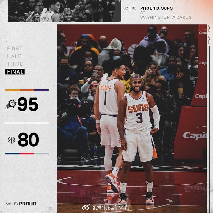 JRS低调看直播2月6日讯 NBA常规赛,太阳客场挑战奇才。太阳刚刚不敌老鹰,连胜虽然遭到终结,仍旧稳居联盟榜首。奇才力克76人止住连败,目前排在东部倒数第五。比尔本场继续缺阵。一开场,奇才率先发力8-2领先,此后太阳大举反击,连续打出进攻高潮,领先12分结束首节。第二节,奇才半节时间仅拿到2分,太阳完成15-0的攻击波扩大优势,半场战罢太阳59-32领先27分。下半场,太阳轻松将分差拉开到30分以上,奇才苦苦支撑,三节打完太阳握有34分领先。第四节,过大的分差让比赛早早失去悬念,双方换上替补耗完垃圾时间。最终,太阳大胜奇才,客场过关。