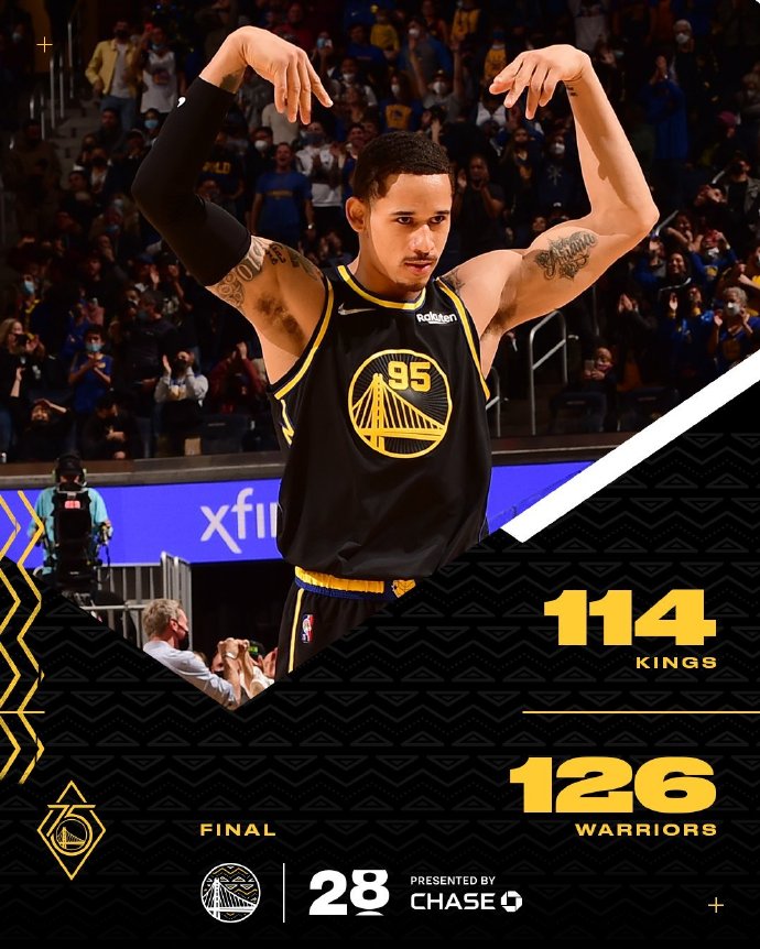 勇士(40-13):克莱23分5篮板7助攻,库里20分7助攻,维金斯12分4助攻,卢尼10分7篮板,库明加18分7篮板,李14分3篮板2抢断,普尔10分5篮板3助攻,穆6分4篮板。