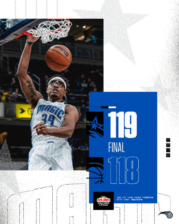 魔术(12-41):哈里斯22分5助攻3篮板2抢断、小卡特19分18篮板2助攻、小瓦格纳17分4篮板2助攻、小安东尼15分8助攻6篮板、萨格斯12分8助攻4篮板、奥基基8分4篮板2助攻、大瓦格纳8分3篮板、班巴7分4篮板2盖帽、小洛佩兹6分3篮板、小罗斯5分3篮板。