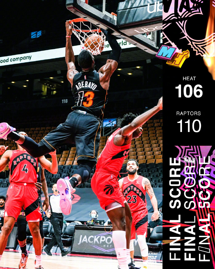 JRS低调看直播2月2日讯 NBA常规赛,猛龙主场迎战热火,两队三天前曾大战三个加时,最终猛龙艰难胜出,此役双方均是背靠背作战。首节热火反客为主取得10-3的不俗开局,猛龙之后虽略有复苏无奈防守不给力,热火很快取得了两位数的领先,次节阿丘瓦、特伦特等人轮番发威,几次将分差缩小到个位数,无奈节末阿德巴约大发神威连得6分,热火在半场结束时依旧保有12分的优势。第三节范弗里特终于复苏,他一人连砍11分带队打出一波14-3瞬间迫近比分,可惜球队罚球命中率不高错失了扳平的机会,热火靠着阿德巴约与巴特勒的强攻勉强维持住优势,末节西亚卡姆、阿丘瓦、特伦特三分如雨,猛龙一波10-0终于反超比分,纵使希罗此后带队连续追分却为时晚矣,阿奴诺比空接上篮杀死比赛。最终,猛龙110-106逆转击败热火取得三连胜。