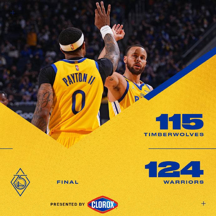 勇士(36-13):库里29分8篮板6助攻6助攻3断,克莱23分5篮板4助攻1帽,维金斯19分5篮板4助攻,波特11分4篮板2断,卢尼7分6篮板,普尔19分5助攻3篮板,库明加4分4篮板,别利察5分6助攻,佩顿4分8篮板,达米安-李3分3篮板