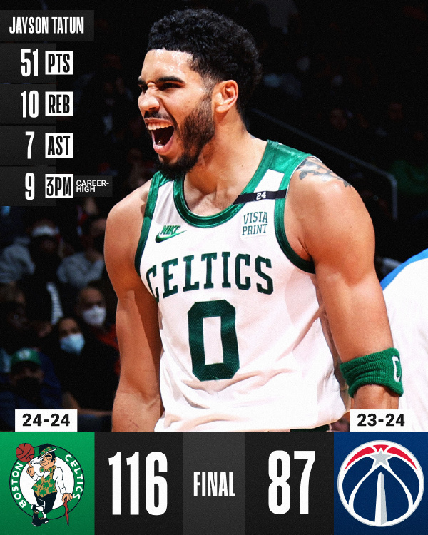 凯尔特人(24-24):塔图姆51分10板7助、布朗18分10板、斯玛特11分4板6助4断、霍福德7分8板、R-威廉姆斯8分8板4助、施罗德7分5助、G-威廉姆斯10分7板