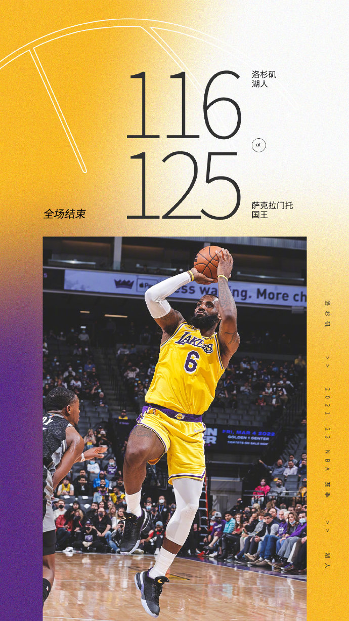 JRS低调看直播1月13日讯 NBA常规赛继续进行,国王主场迎战湖人,国王此前状态不是很好,一波5连败已经掉落至西部第12位,而湖人4连胜后惨败于灰熊目前也掉落至西部第7位,本场安东尼因腰部紧张缺阵。开局湖人外线手感不错,但国王也是连续冲击内线给出回应,双方打得非常胶着,湖人依靠自身的经验优势,在詹姆斯的带领下占据5分领先,次节国王上来外线手感不错将比分追平,但詹姆斯又站出来里突外投帮助湖人打出超级进攻波一举建立双位数领先,节末国王也回应8-0小高潮将分差又追至6分。第三节风云突变,虽然湖人外线三分还能帮助止血,但国王通过连续冲击湖人孱弱内线,配合着外线巴恩斯的三分,国王打出超级进攻波并单节轰下40分一举建立双位数的领先,末节湖人依靠外线三分紧急追分,但国王也都能给出回应,双方外线对飚,但国王始终保持领先,虽然最后时刻詹姆斯一度帮助湖人追到差2分,但梅图三分一击毙命,最终国王击退湖人,终止自己的5连败。