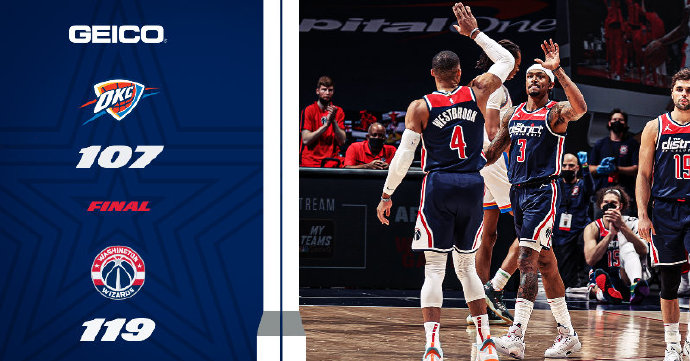 奇才(24-33):比尔30分3抢断,威斯布鲁克13分11篮板17助攻8失误,莱恩9分4篮板,贝尔坦斯21分3篮板,加福德13分5篮板,洛佩兹17分,阿夫迪亚6分6篮板。