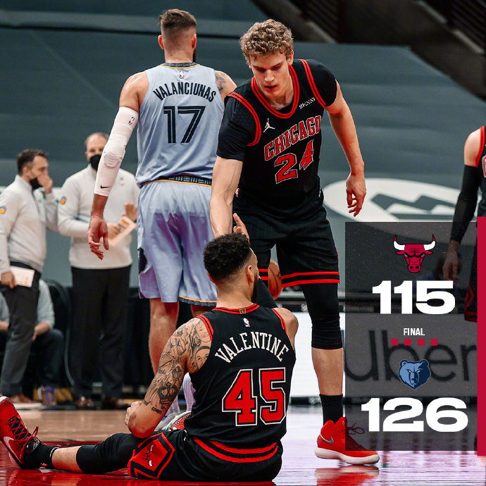 JRS低调看直播4月17日讯 NBA常规赛灰熊对阵公牛,刚开场两队就连续在外线对飚三分,虽然灰熊一度取得领先,但公牛马上追上比分。第二节轮到公牛率先发力掀起攻势,灰熊进攻内线再度追平比分,场上局势仍旧胶着,上半场结束时两队打成57平。下半场回来虽然公牛进攻仍旧表现不错,武切维奇频频砍分,但他们防守不佳被灰熊打出高潮拉开比分,第四节灰熊将领先优势稳定在两位数,公牛无力回天,最终灰熊126-115送给公牛5连败。