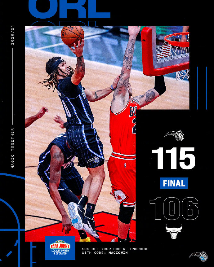 JRS低调看直播4月15日讯 NBA常规赛,公牛主场迎战魔术。公牛近期遭遇了三连败,目前排在东部第十,领先身后的球队仅两个胜场。魔术更是遭遇了六连败,排名仅高于活塞,列东部倒数第二。一开场,双方均很快进入状态,连续投篮命中,魔术多点开花,领先10分结束首节。次节初段魔术延续火力继续保持领先,后半段公牛突然发力,一波12-3将半场分差缩小到1分。易边再战,武切维奇里突外投帮助公牛咬住比分,无奈魔术火力全开连中四个三分,三节打完魔术领先21分。末节争夺,公牛如梦方醒,拉文连续三分将分差缩小到个位数,恩尼斯三分杀死比赛。最终,魔术客场战胜公牛,结束六连败的同时送给对手四连败。