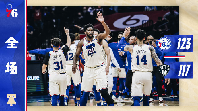 JRS低调看直播4月15日讯 今日NBA常规赛,篮网客场挑战76人,本场比赛欧文复出,杜兰特格里芬轮休。比赛开始后,76人率先发力取得9分领先,欧文首节发挥出色,自己得分的同时不断串联队友,篮网始终紧咬比分,首节结束76人32-28领先篮网4分。第二节比赛前半段,托拜亚斯-哈里斯里突外投接连得分,恩比德后半段发力接连站上罚球线,篮网半场58-65落后7分。下半场比赛开始后,篮网进攻效率降低,76人内外兼修不断扩大领先优势,分差一度来到16分,之后欧文发力连续得分替篮网缩小分差,三节战罢,篮网依然落后76人10分。最后一节,76人保持出色外线手感,接连打出进攻高潮将分差扩大至20分,篮网之后发起反扑一度将分差缩小至3分,76人依靠罚球稳住胜局,最终76人123-117主场击退篮网。