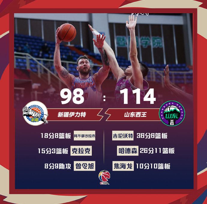 JRS低调看直播4月11日讯 CBA常规赛倒数第二轮,新疆与山东侠路相逢,目前新疆已经锁定常规赛第四名,山东则暂列第五,此役高诗岩因伤缺阵。首节两队均是内外结合,比分也始终紧咬,但新疆老大难的罚球问题还是让他们处于追赶者的角色,次节周琦因为身体原因被迫下场,新疆的进攻几次断电,山东则是多点开花很快就确立了两位数的领先优势。第三节山东在哈德森的带领下下起一阵三分雨,单节八记三分射得新疆晕头转向,节末一波8-0的攻击波后更是将分差扩大到24分,末节新疆一度送出10-0的攻势看到了追平的希望,但吉伦沃特单节爆砍17分彻底杀死比赛悬念,最终山东114-98击败新疆,取得三连胜的同时也送给对手三连败。
