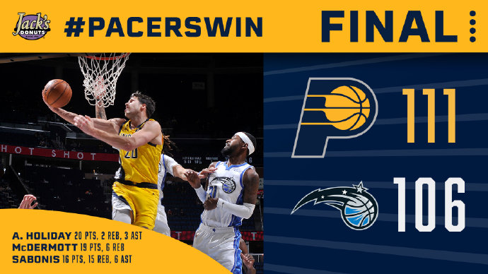 JRS低调看直播4月10日讯 今日NBA常规赛,步行者客场挑战魔术,加里-哈里斯首次代表魔术出战,萨博尼斯与布罗格登本场比赛迎来复出。比赛一开始,双方比分便陷入胶着,魔术连突内线取得领先,步行者则内外兼修始终紧咬比分,随着节末A-霍勒迪连续甩进两记三分,步行者领先魔术3分结束首节。第二节比赛后半段,魔术陷入得分荒,接连多次投篮打铁,步行者抓住机会打出一波11-0将比分扩大,半场结束64-51领先13分。易边再战,步行者进攻效率降低,魔术里突外投不断得分一度将分差缩小至3分,随着麦康纳压哨抛投得手,三节战罢,步行者83-78领先魔术5分。末节开始,步行者里突外投不断扩大领先优势,分差一度来到15分,魔术多次尝试反扑,但分差太大最终无力回天,步行者客场111-106战胜魔术。