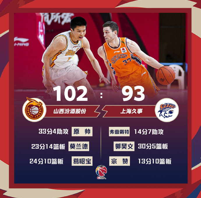 山西(18-33):原帅33分4助,葛昭宝24分10板4助,莫兰德23分14板3助,闫鹏飞6分8板2断,周湛东3分,刘冠岑7分6板2助,张宁4分