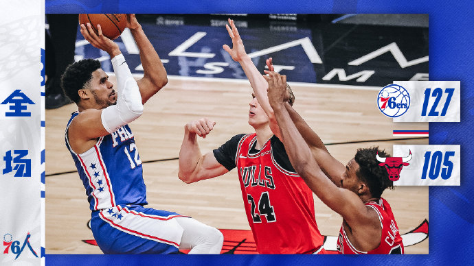 JRS低调看直播3月12日讯 NBA常规赛公牛主场对阵76人,本场比赛76人的恩比德和西蒙斯双双缺阵,开场后两队你来我往互不相让,不过76人依靠整体发挥逐渐取得领先。第二节虽然公牛一度依靠马尔卡宁、怀特和拉文三人的三分追平比分。但哈里斯带领76人稳住节奏,上半场76人64-57领先公牛。下半场回来76人仍旧占据场上主动,虽然赛迪斯-杨频频砍分也只是帮助公牛没有被拉大分差,第四节开始科克马兹和霍华德更是带领轮换阵容打出一波高潮直接锁定胜局,最终76人127-105轻松拿下公牛。
