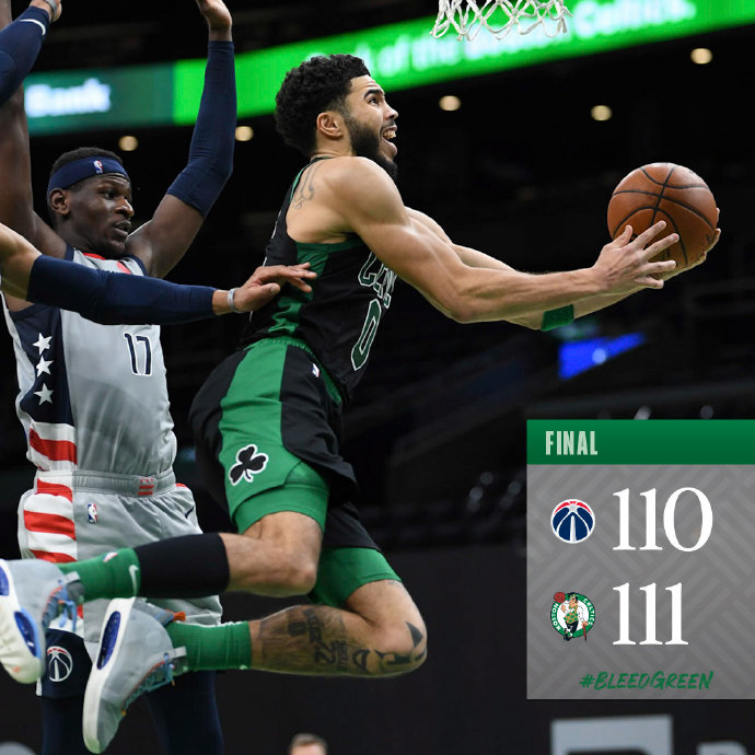 JRS低调看直播3月1日讯 NBA常规赛,凯尔特人坐镇主场迎战奇才,前者上一场击败了步行者结束连败,后者则正在经历两连胜,此役布朗因伤缺阵。首节开局凯尔特人一波7-0取得领先,奇才通过造杀伤在罚球线缩小分差,塔图姆和贝尔坦斯互相回应三分球,两队陷入拉锯战,次节塔图姆延续良好手感,奇才则由比尔连续打中紧咬比分,半场凯尔特人60-55领先五分。下半场风云突变,绿军打成一波小高潮拉大分差,随后进攻效率下降,奇才不断蚕食分差,三节结束时追到只差三分,末节绿军进攻依然不理想,奇才众人发力很快获得反超,这时泰斯站出来连得八分稳住局面,随后双方进入球星对飙,比尔连续打中帮助奇才扩大分差,凯尔特人稳扎稳打迫近比分,还是比尔站出来连传带攻使奇才占据主动,塔图姆两记突破后又造成比尔失误,杀进禁区再中获得反超,比尔绝杀不中,凯尔特人111-110险胜奇才。